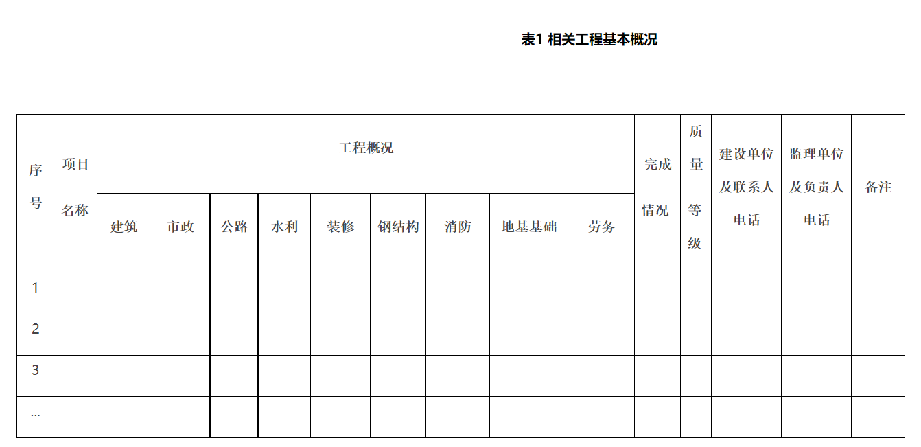 3、各公司根據本企業的資質范圍,分別填報相應的業績材料(如房屋建筑、市政工程、公路橋梁工程、水利(電)工程、地基及基礎處理工程等)。(見表1)
