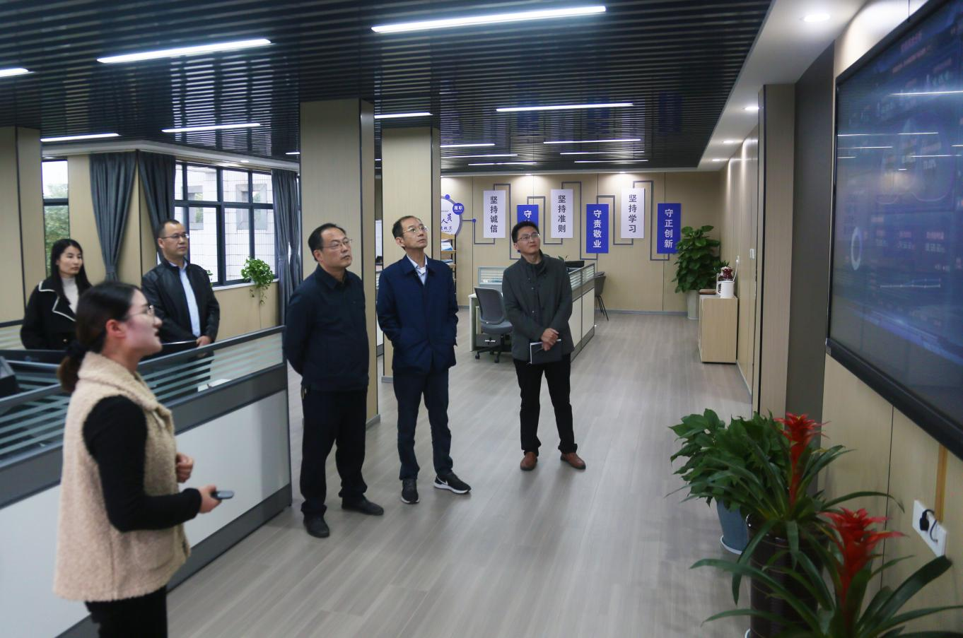 隨后,汪偉一行來到辦公大廳觀看智能運營分析大屏及財務RPA機器人自動對賬演示,了解了財務共享運營在線監測、財務綜合分析、預算指標實時監控等情況。