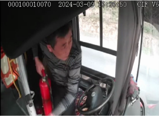 他立即將車輛安全停靠在路邊,迅速解開安全帶,提起身邊的滅火器奔向著火車輛。利用日常掌握的消防滅火知識,準確找到起火位置,對準火焰根部進行噴射,火勢很快得到了控制。為防止火勢復燃,他又即刻返回車上,拿起水桶對準車輛著火點進行二次覆滅。在確保險情徹底消除后,他才放心返回車上繼續執行營運任務。整個救援過程,短短幾分鐘,規范、準確、快速、高效,及時消除了火災事故。