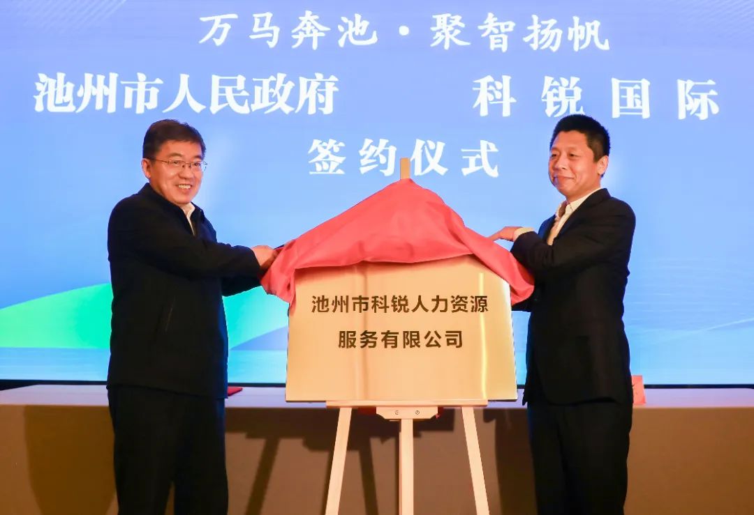 4月2日上午,池州市政府與科銳國際合作交流座談會暨合作項目簽約儀式舉行。市委書記朱浩東、科銳國際董事長高勇出席并講話,共同為池州市科銳人力資源服務有限公司揭牌。市領導史孺牛、廖強、李軍等參加。