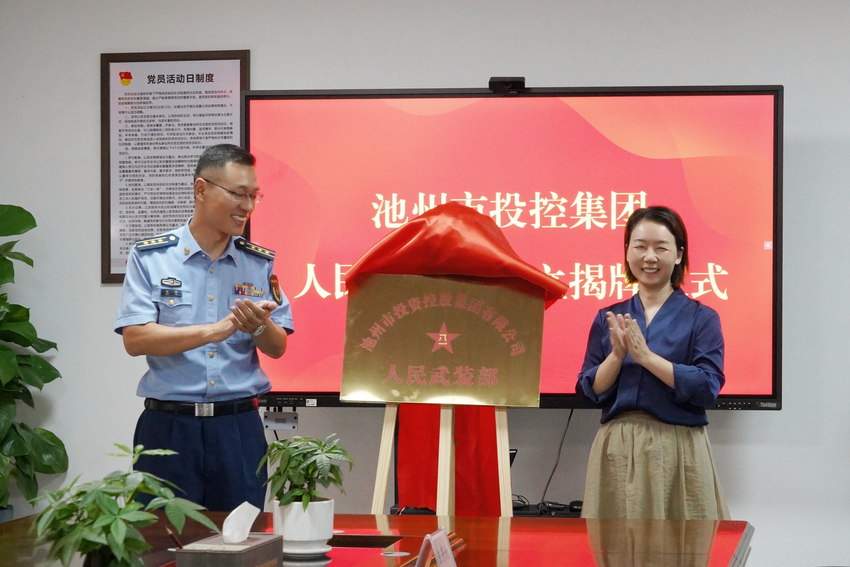 7月31日上午,池州市投資控股集團有限公司舉行人民武裝部成立揭牌儀式,貴池區委常委、區人武部政委馮濤與集團黨委副書記、工會主席嚴艷共同為集團人民武裝部揭牌。集團總經理助理、黨群工作部經理汪興安等參加活動。